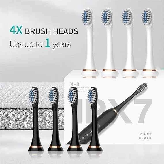 4 cabezales de cepillo de repuesto: el cepillo de dientes eléctrico para adultos viene con 4 cabezales de cepillo de dientes, que se pueden utilizar durante 1 año. Las cerdas del cabezal del cepillo de dientes están hechas de nailon DuPont, que es suave, resistente al desgaste y no absorbente. El cabezal del cepillo de onda W se adapta perfectamente a cada diente, frota la superficie del diente y entre los dientes más estrechamente, y limpia más a fondo.