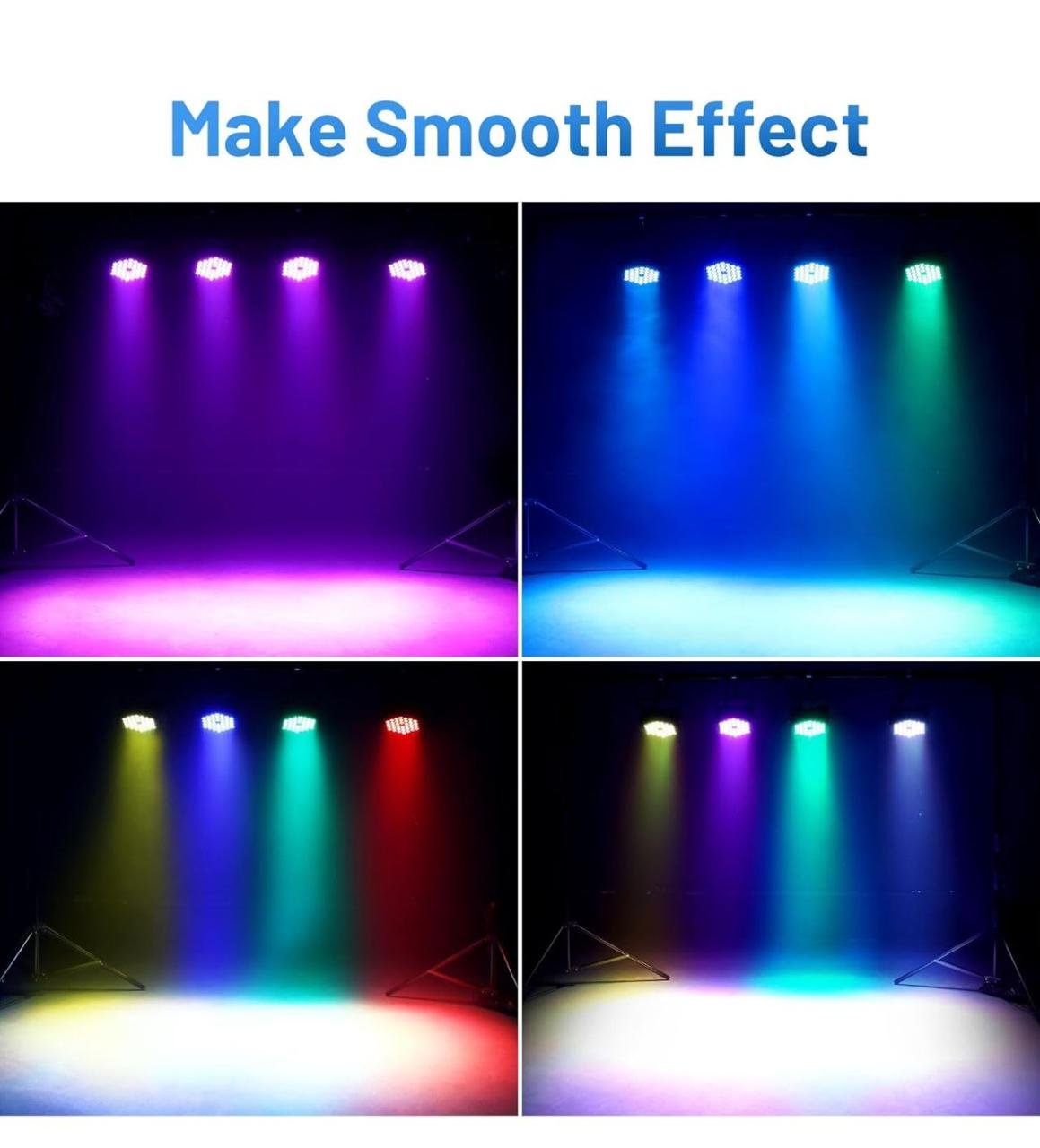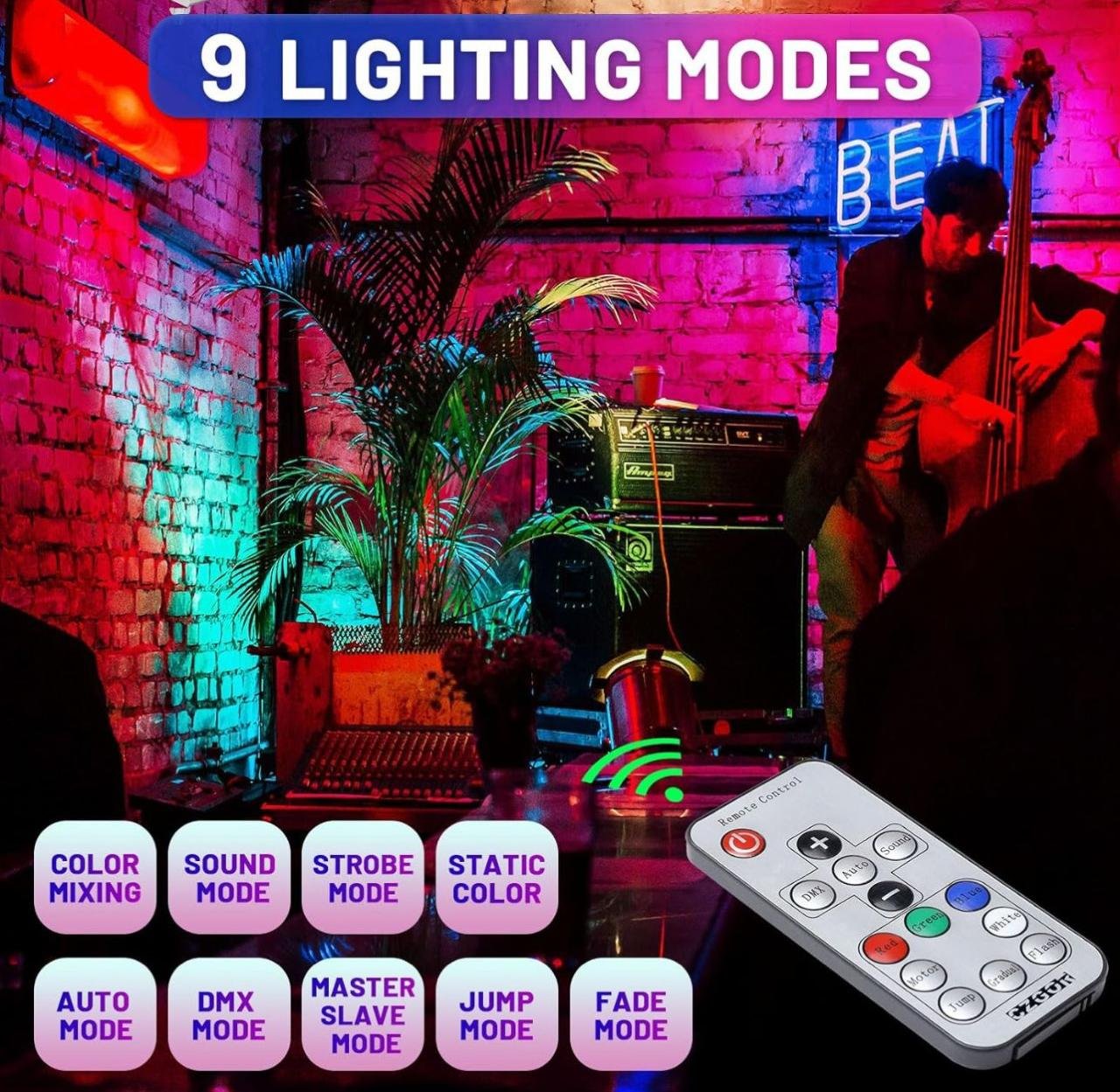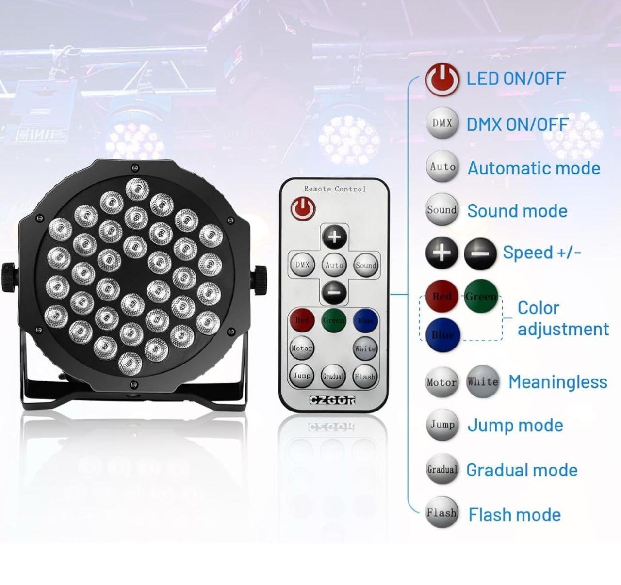 Las entradas y salidas del puerto DMX se encuentran en la parte posterior del foco para controlar el LED par. Puedes encender/apagar, cambiar los modos y cambiar de color pulsando el botón en la parte posterior de las luces de DJ. Lo que es más importante, las luces de escenario pueden grabar tu última operación innecesaria para reiniciar.